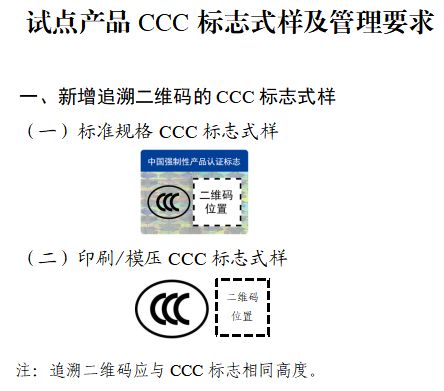 CCC认证标志试点改革涉及的产品将调整CCC认证标志式样,在原有标志图案右侧标注追溯二维码,二维码信息由认证机构在签发认证证书时免费向获证企业提供。