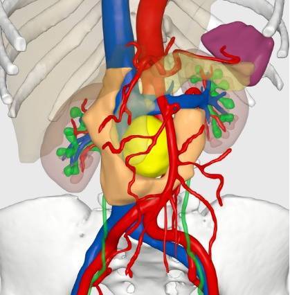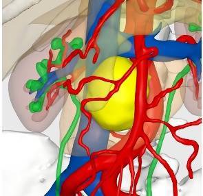 面对这一高难度病例,刘龙飞教授团队为其进行了全面细致的评估。结合相关检查和患者典型的临床表现,团队最终精准诊断其为腹膜后副神经节瘤。该肿瘤位于腔静脉与腹主动脉之间,周围被十二指肠、胰腺、肾静脉、肠系膜动脉包绕,周围解剖结构异常复杂,位置深,且嗜铬细胞瘤/副神经节瘤本身血运极其丰富,手术暴露切除难度大,对术者的手术技巧要求极高。